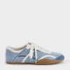 These sneakers in blue are made with genuine leather and denim. They feature contrast trims and soles, as well as softly rounded toes and classic lace-up closures. Pair them with your favourite casual outfits for a relaxed, stylish look.