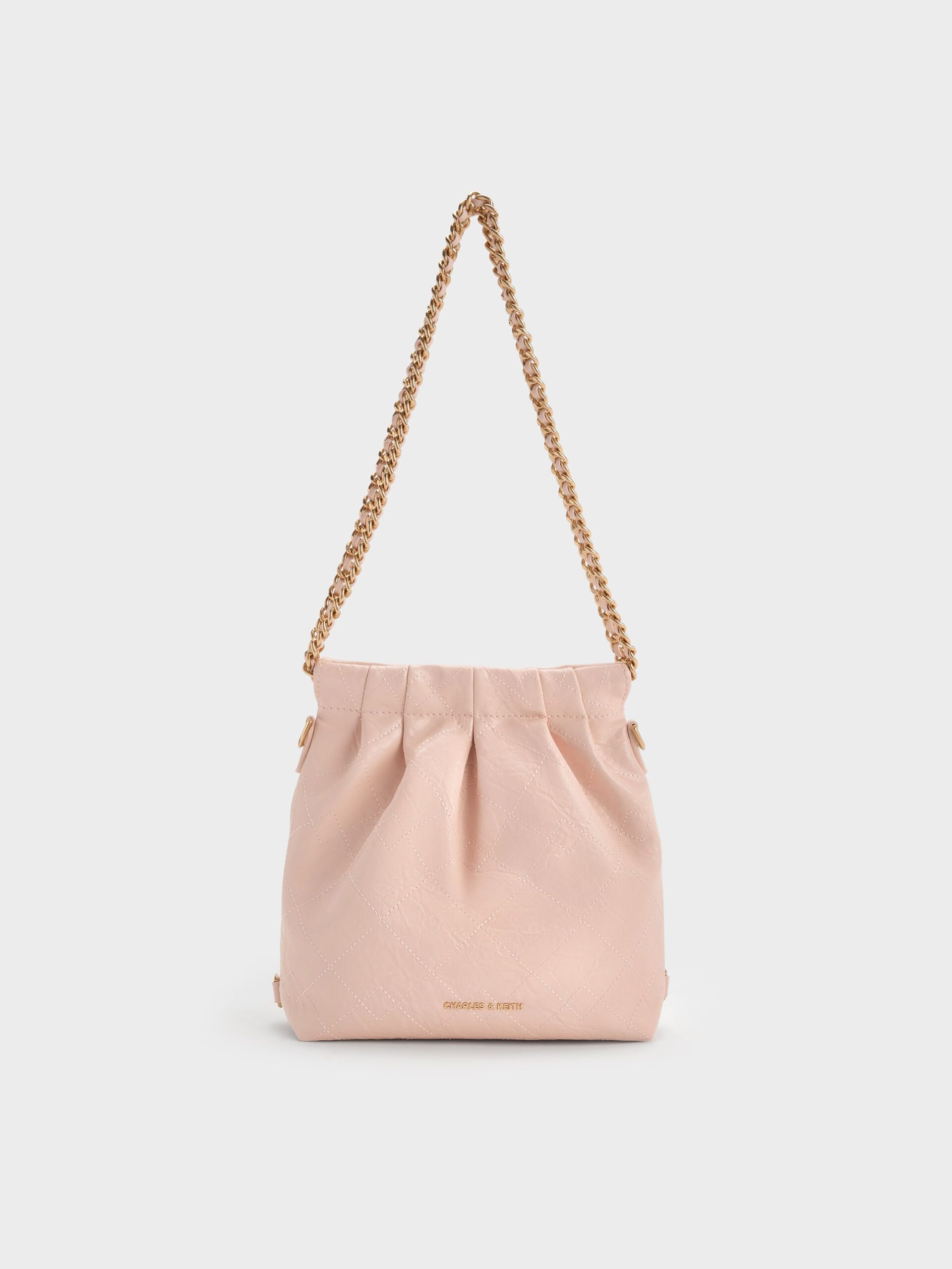 This Duo backpack in pink features a quilted design, a secure magnetic closure and braided chain handles. This bag can also be carried as a shoulder bag, making it is ideal for those who love a design that can be used in different ways.