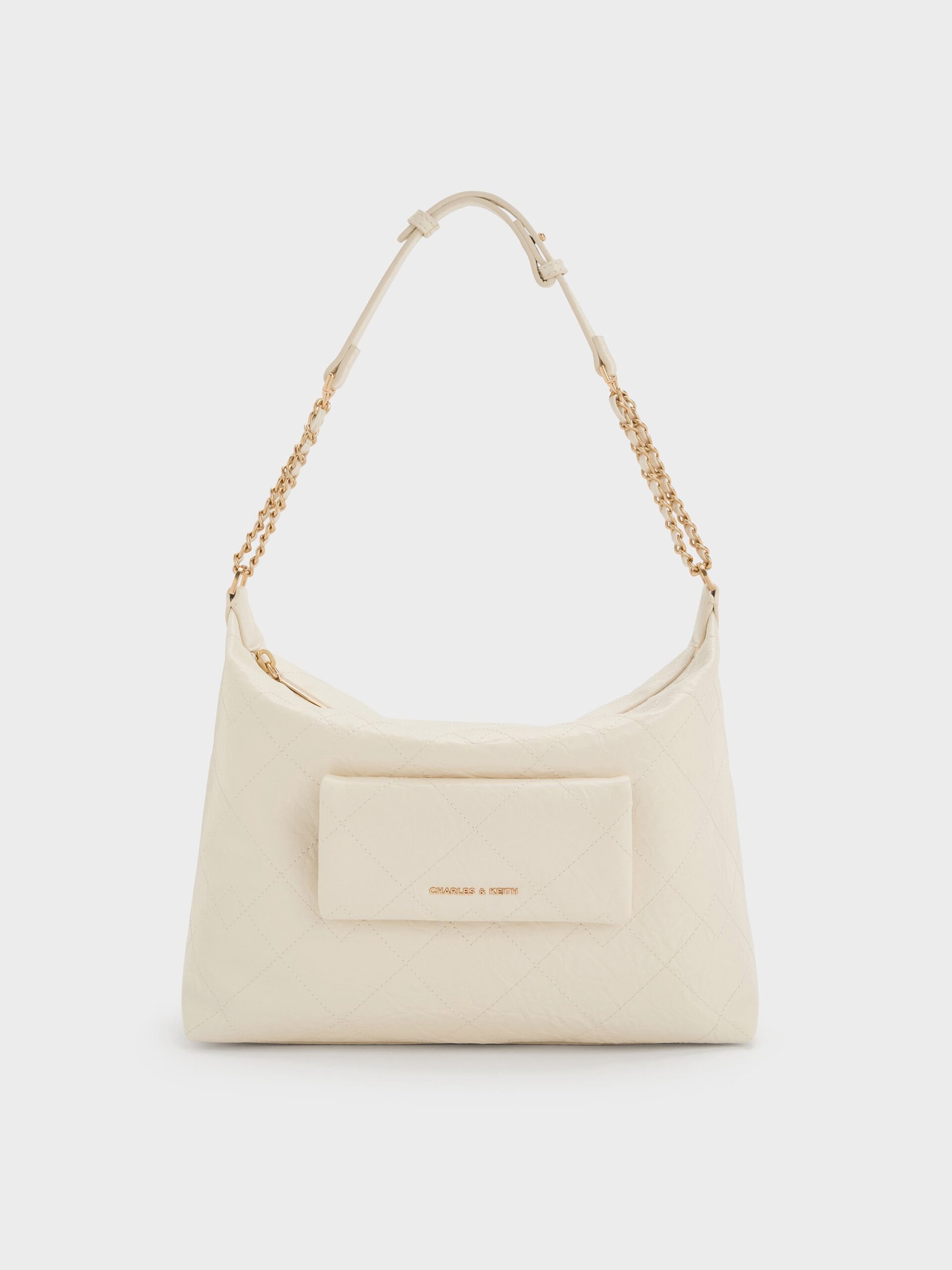 This Duo hobo bag in cream features a quilted design, a front pocket, a braided-chain shoulder strap and a spacious main compartment that is secured by a zip closure. It will complement tailored separates with its distinctive crinkle-effect texture and softly structured shape.