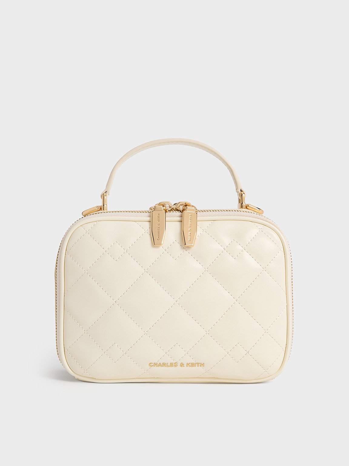 A beautiful bag to hold and behold, the Duo vanity bag in cream is a fabulous choice, especially for date nights and special occasions. Featuring a glossy finish, a boxy quilted design and a classic top handle, this carrier exudes elegance from every angle. It also features a dual zip opening on the front and back that offers ample space to hold your must-have essentials. The best part? The braided chain strap lets you keep your hands free while looking dressy enough for formal settings.
