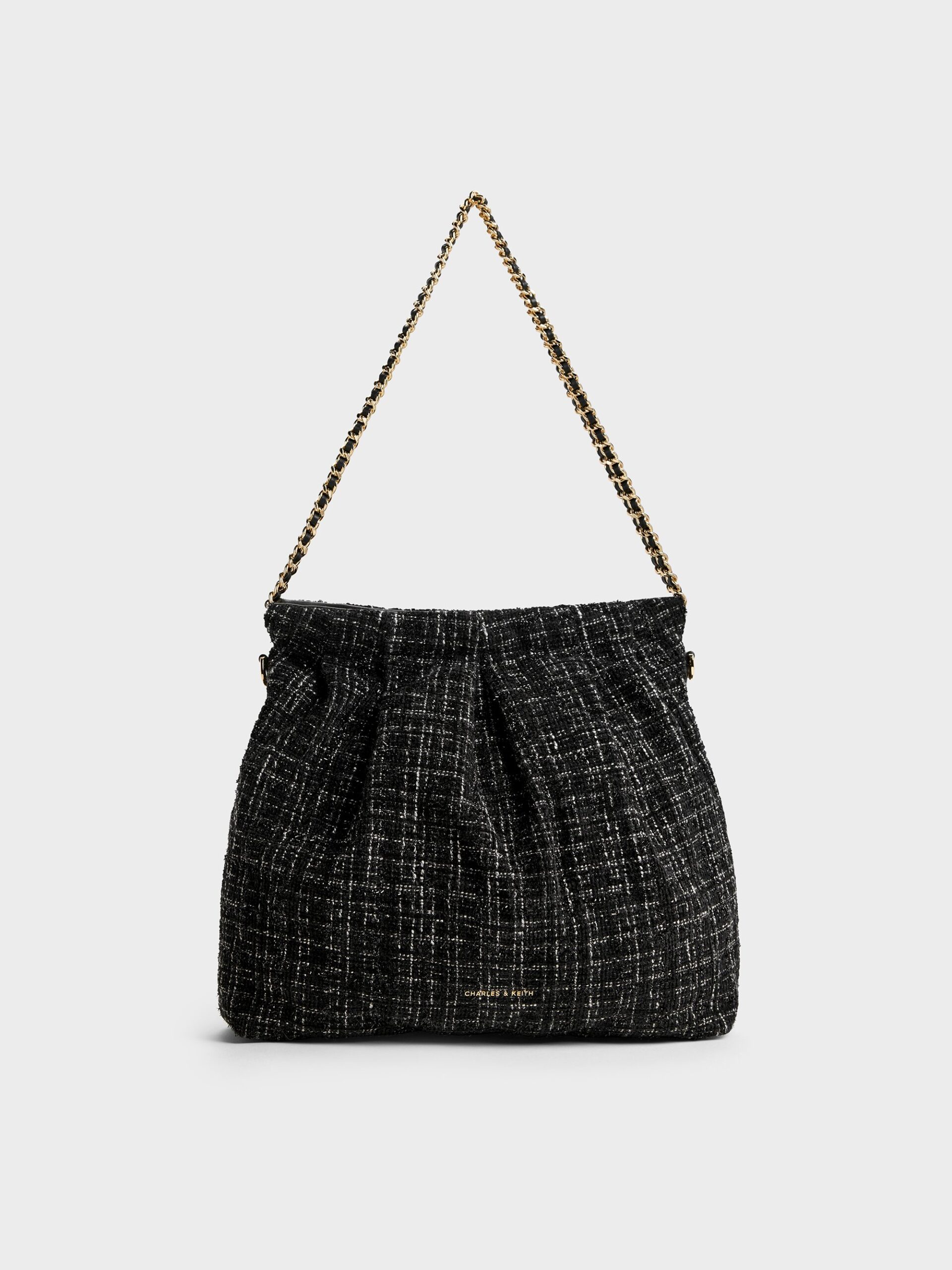 This Duo hobo bag in black is made with tweed and features double chain handles and a magnetic closure. Use it to bring soft tactility and understated sophistication to your weekday outfits.