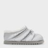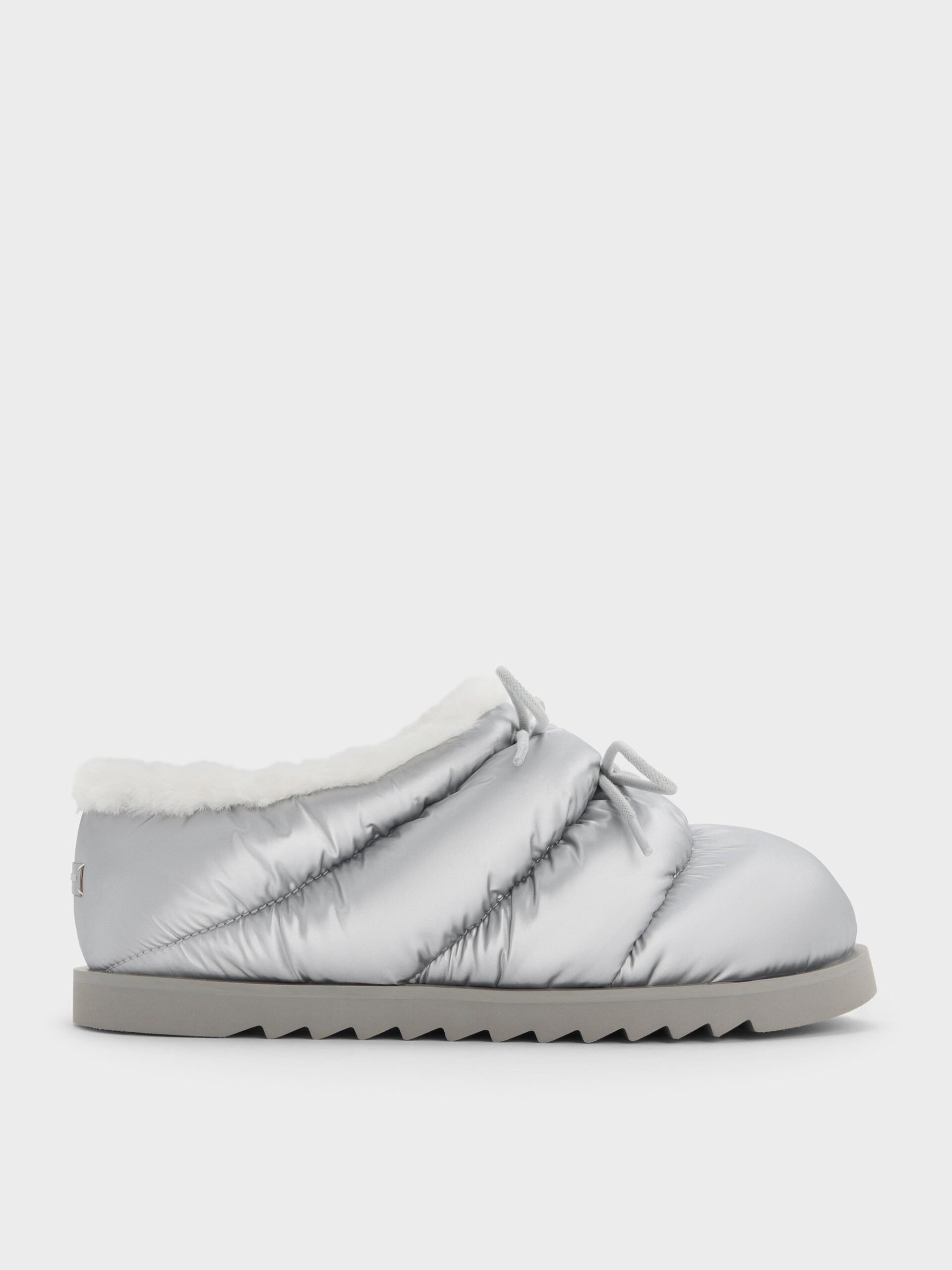 These Egan mules in silver are made with nylon and feature puffy panelled uppers, lace ties, round toes, and ridged flat soles. Use them to add eye-catching shine to your fall-winter outfits.