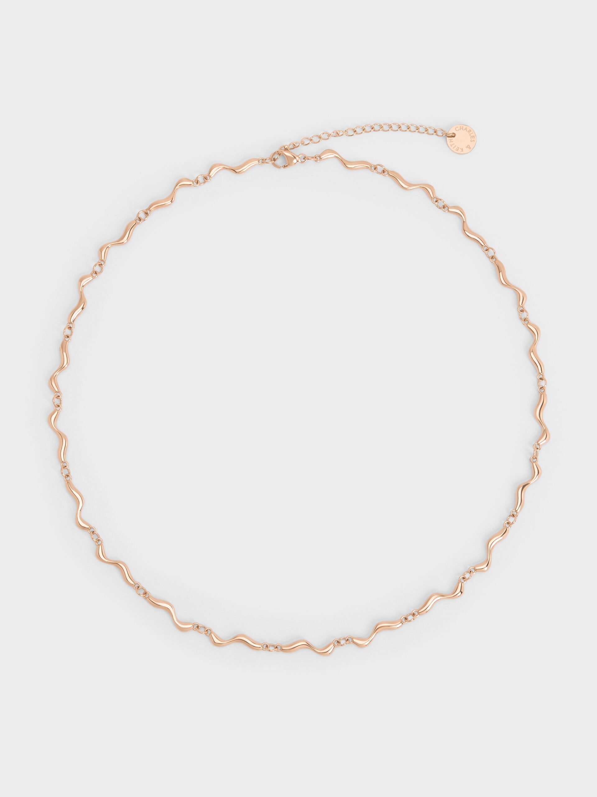This Emilia circle necklace in rose gold features a sculptural, wavy design that is simple yet striking. Wear it with v-neckline tops or dresses and let it elevate your look with understated shine.