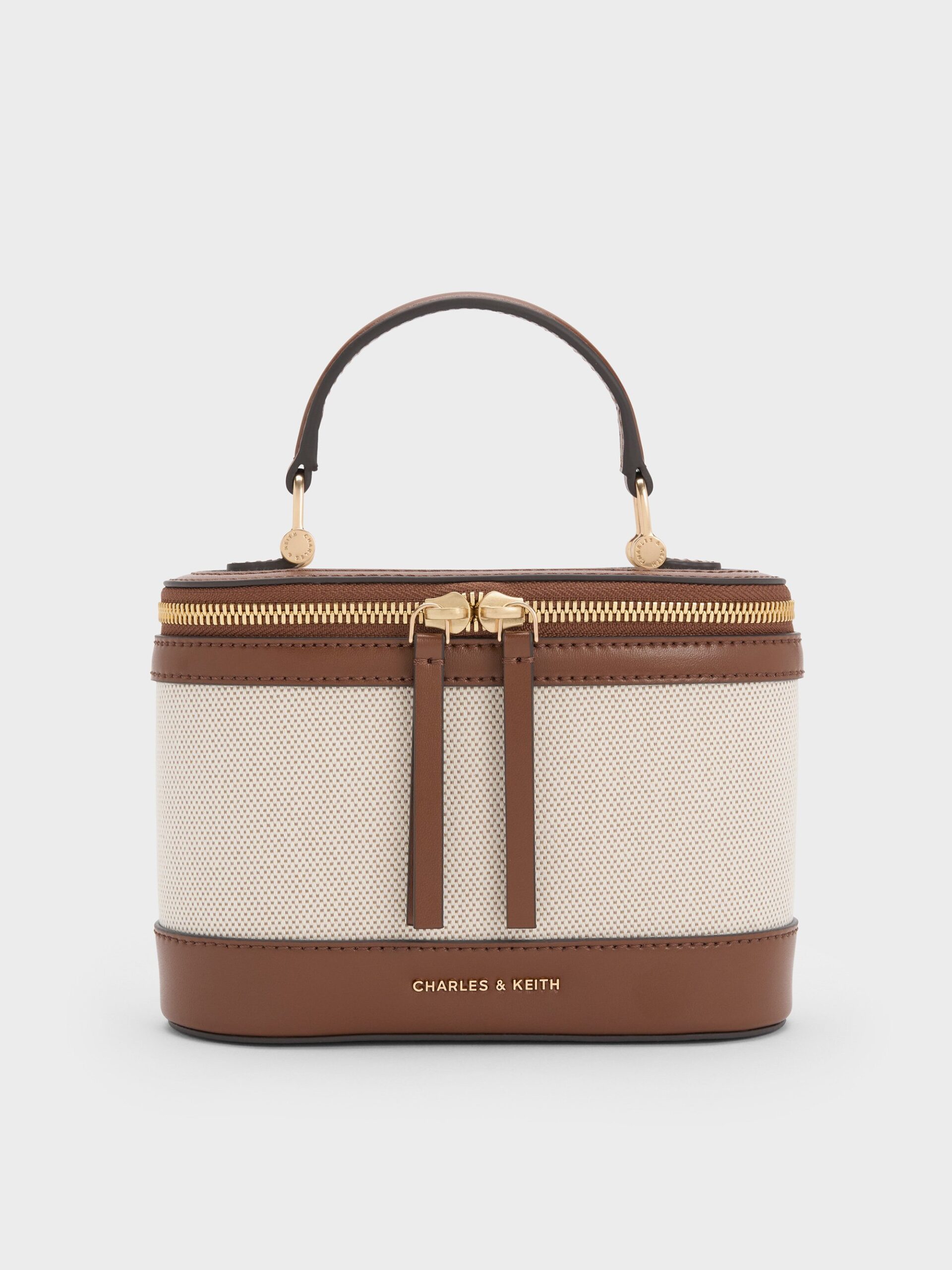 This Enola vanity bag in chocolate is made with canvas and features a two-tone design, double-zip closure, an elegant top handle and a detachable strap. Use it to level up casual edits with striking details and functional design.