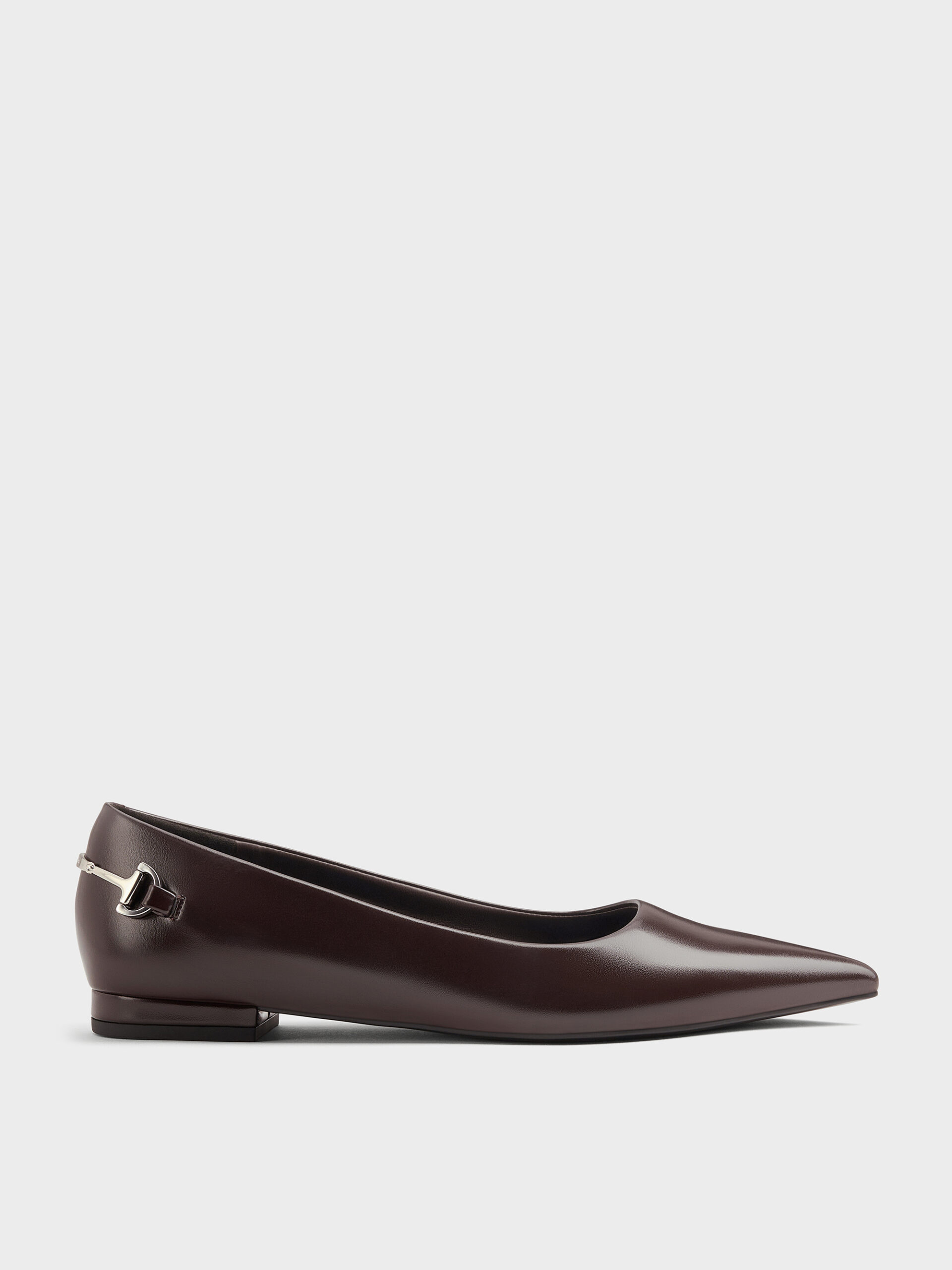 These Erinna flats in burgundy feature pointed toes and metallic accents at their backs for subtle visual interest. Use them with sleek jumpsuits to achieve a composed occasion style that stands out through quiet sophistication.