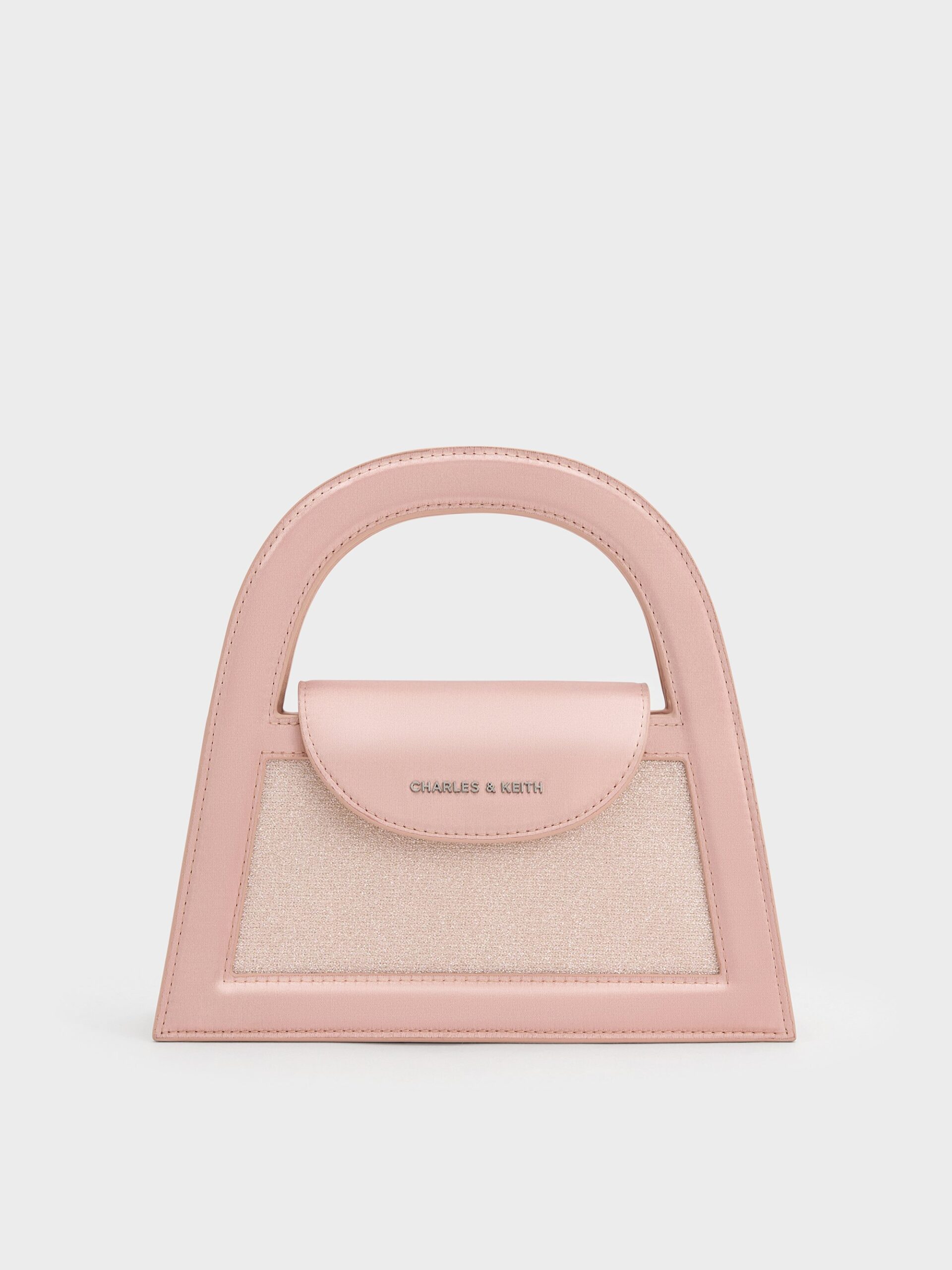 This Este top handle bag in pink is made with satin and features a glittered finish, curved double handles, a boxy trapeze construction and a magnetic closure. Let them complement bold special-occasion outfits with their outstanding design.