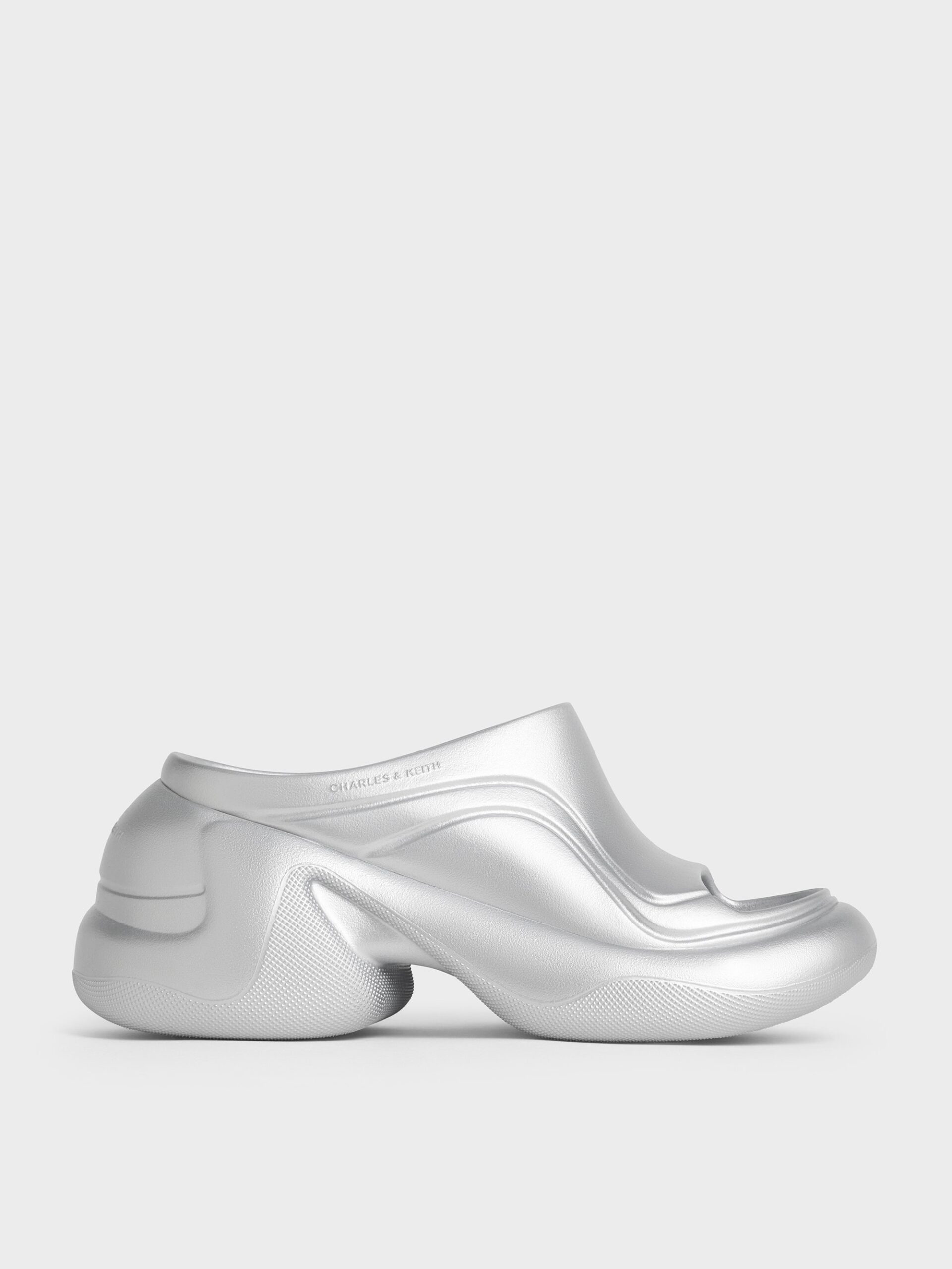 Complete your looks with these statement shoes.The chunky platform style is given an edgy appeal with the shiny silver finish. Featuring an open-toe design, they are a breathable option for hot days and tropical vacations.
