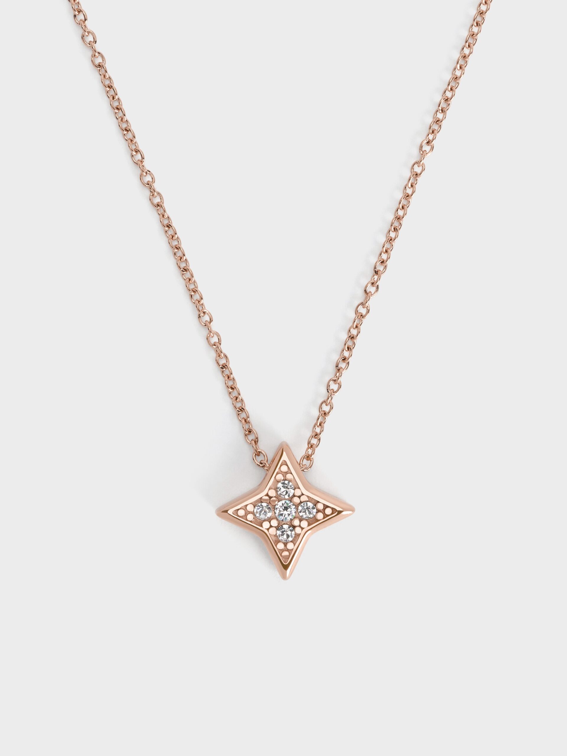 This Everest necklace in rose gold features a thin, delicate chain and a 4-point star pendant — its length can be adjusted. Use it to enhance warm-toned outfits with subtle sparkle and refined femininity.