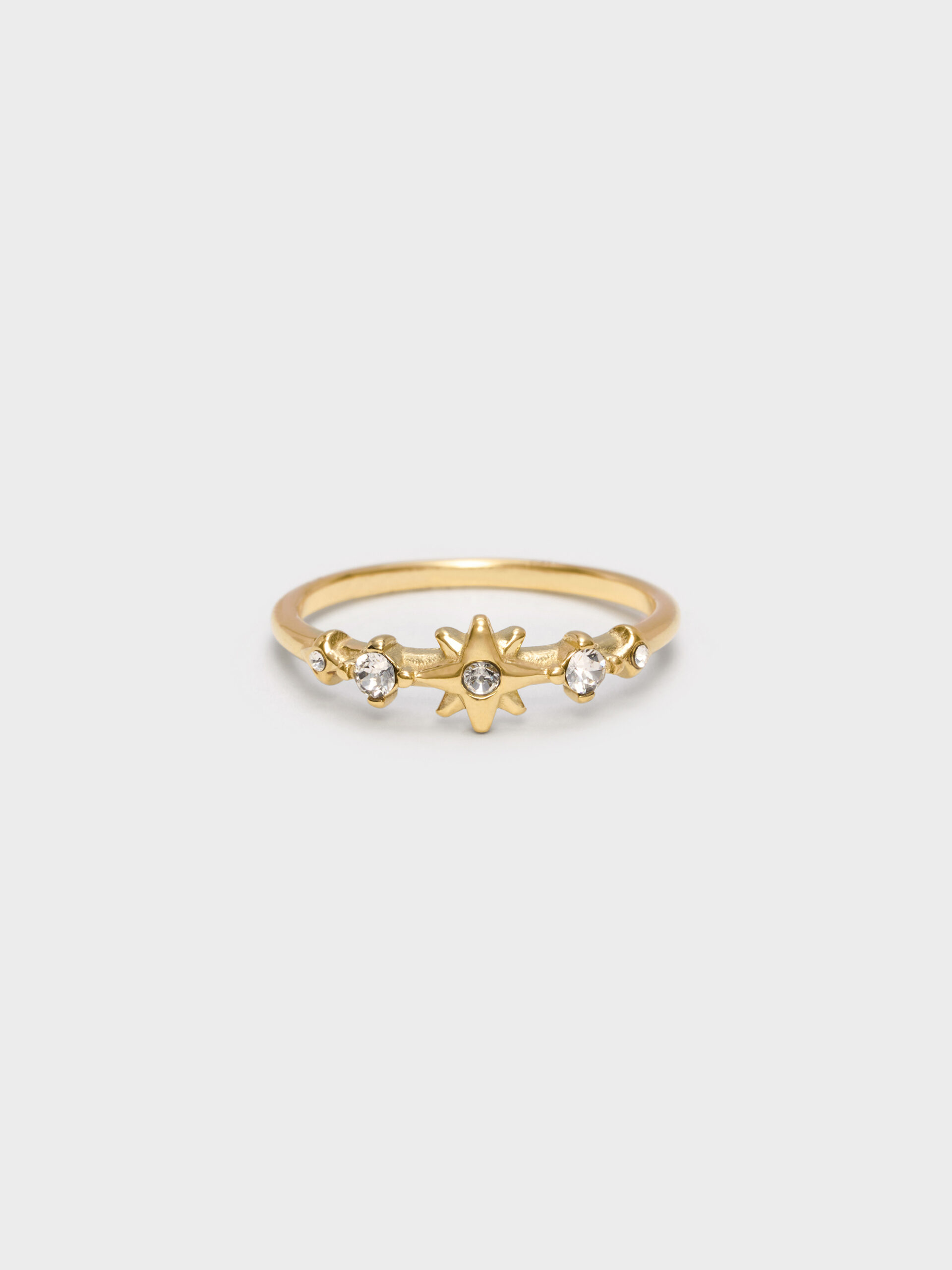 This Everest ring in gold features crystal embellishments, striking star motifs and a thin curved band. This piece will shine on its own, but can also be stacked with other rings to create a statement stack.
