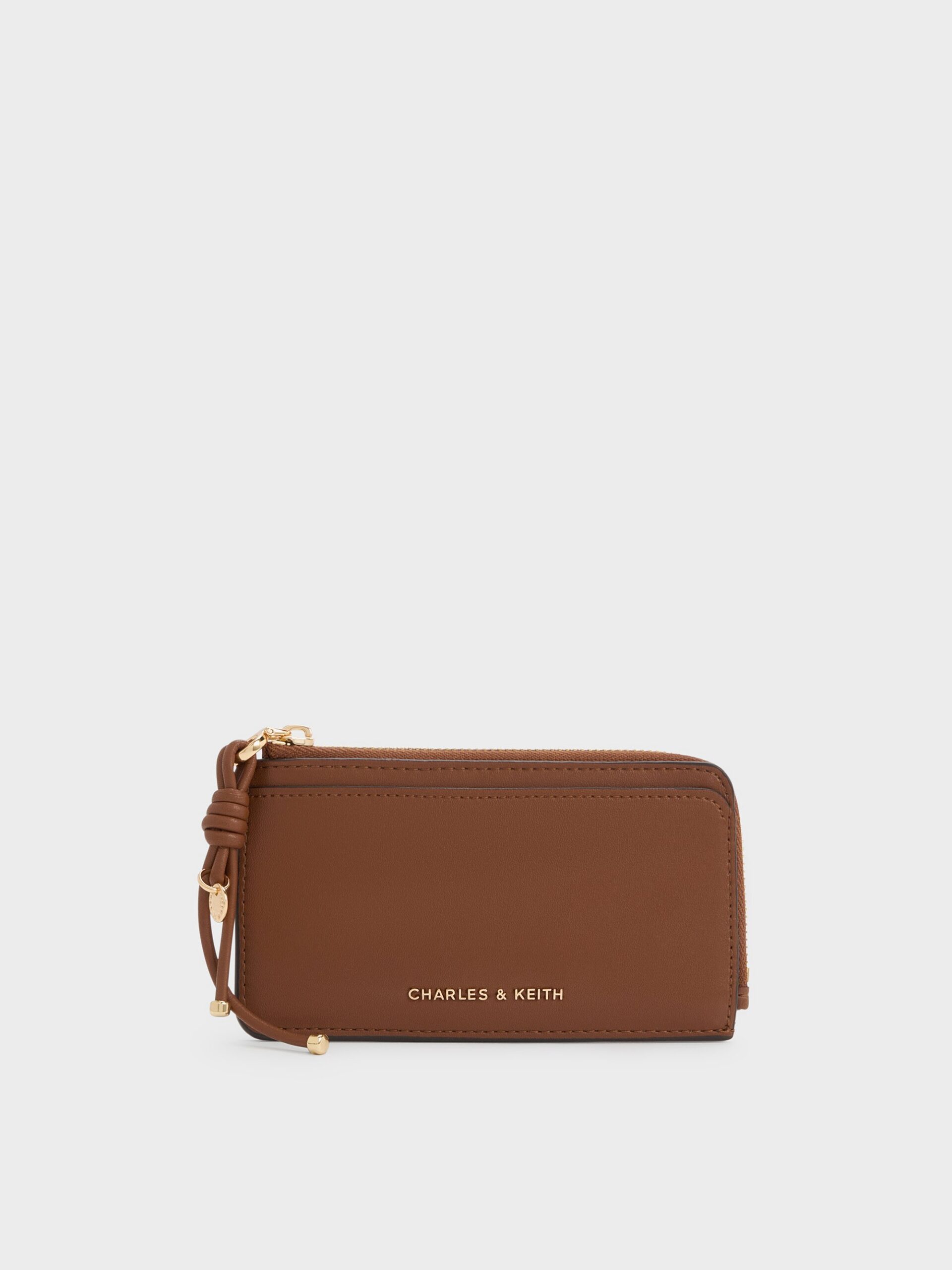 This Everleigh card holder in chocolate features a classic rectangular shape, a knot detail, a front slip pocket and a zip-around closure for added security. It offers ample space for holding cards, cash and other small items.