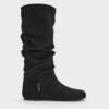 These knee-high boots in black are made with faux suede and feature ruched shafts, rounded toes and flat soles. Pair them with layered knits to create a timeless and versatile cold-weather ensemble.Suede shoes require special care. For cleaning tips, please refer to our detailed guide here.