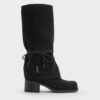 These knee-high boots in black are made with faux suede and feature tie-around laces, chunky block heels, handy side zips and rounded square toes. Wear them with long coats or fluid dresses to create effortless yet outstanding winter looks.Suede shoes require special care. For cleaning tips, please refer to our detailed guide here.