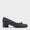 These pumps in dark grey are made with felt and feature bow details, metallic accents, square toes and block heels. They will add an interesting textural element to your everyday workplace outfits.