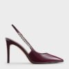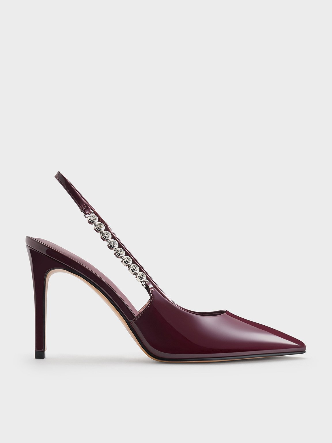 These burgundy pumps are the perfect way to transition from weekdays to weekends. Featuring gem embellishments on the straps and a shiny patent finish, they are a glamorous take on the classic pointed-toe style. Elevated on stiletto heels, they will also give you a flattering height boost.