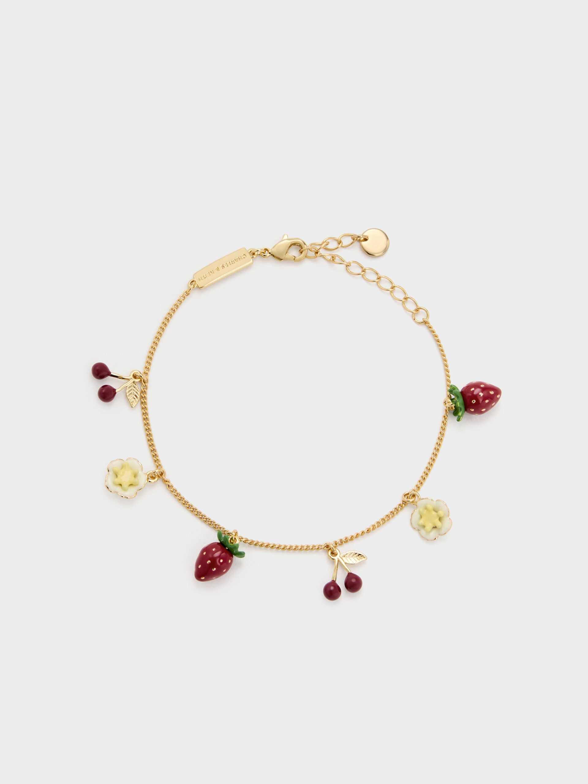 This Francie bracelet in gold features a polished chain adorned with cute and colourful charms in the shape of strawberries, cherries and flowers. Wear this eye-catching piece to add a touch of whimsy to your everyday routine.