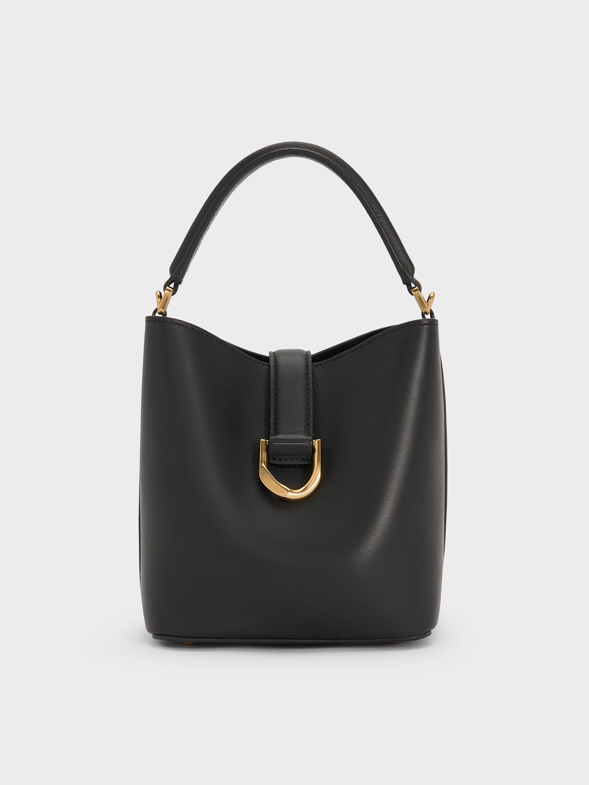 This Gabine bucket bag in black is made with genuine leather and features a belted flap with the iconic horseshoe buckle. It also comes with a detachable top handle and longer shoulder strap so you can carry it in different ways.