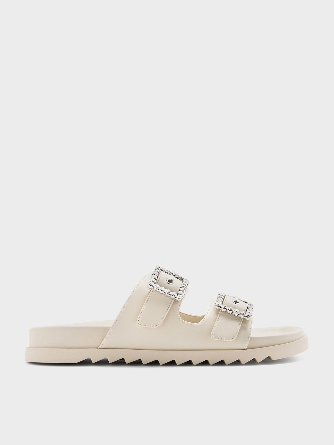 Give your casual outfits a touch of glamour with these sandals. The gem-embellished buckles strike an eye-catching contrast against the clean chalk finish. With its cushioned footbeds and secure double-strap design, they will also provide all-day comfort.