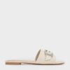 Looking sophisticated with a pristine chalk finish, these slide sandals will add a touch of glamour to your everyday outfits. Featuring gem-embellished buckles on belted details, these satin shoes have a relaxd-yet-luxurious aesthetic.
