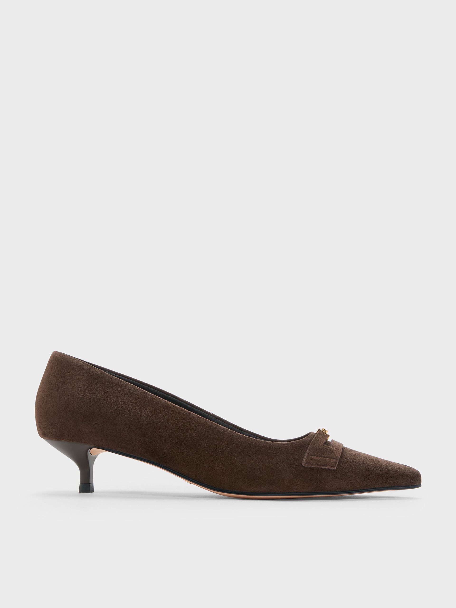 These Georgina pumps in dark brown are made with suede and feature pointed toes and kitten heels. Use them to refine everyday outfits with luxurious texture, clean lines and warm colour.Genuine suede is delicate and requires special care. After each use, gently brush in the direction of the nap with a suede brush to remove dust and dirt. Avoid water or wet wipes, as they may cause stains. Store in a cool, dry place away from direct sunlight.