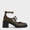 In deep olive, these Mary Jane pumps are just as versatile as black. They will add subtle colour to an all-black ensemble while also matching well with bright-coloured outfits. Set on sturdy block heels, they offer a flattering height boost — their double-strap design also provides an extra secure fit.
