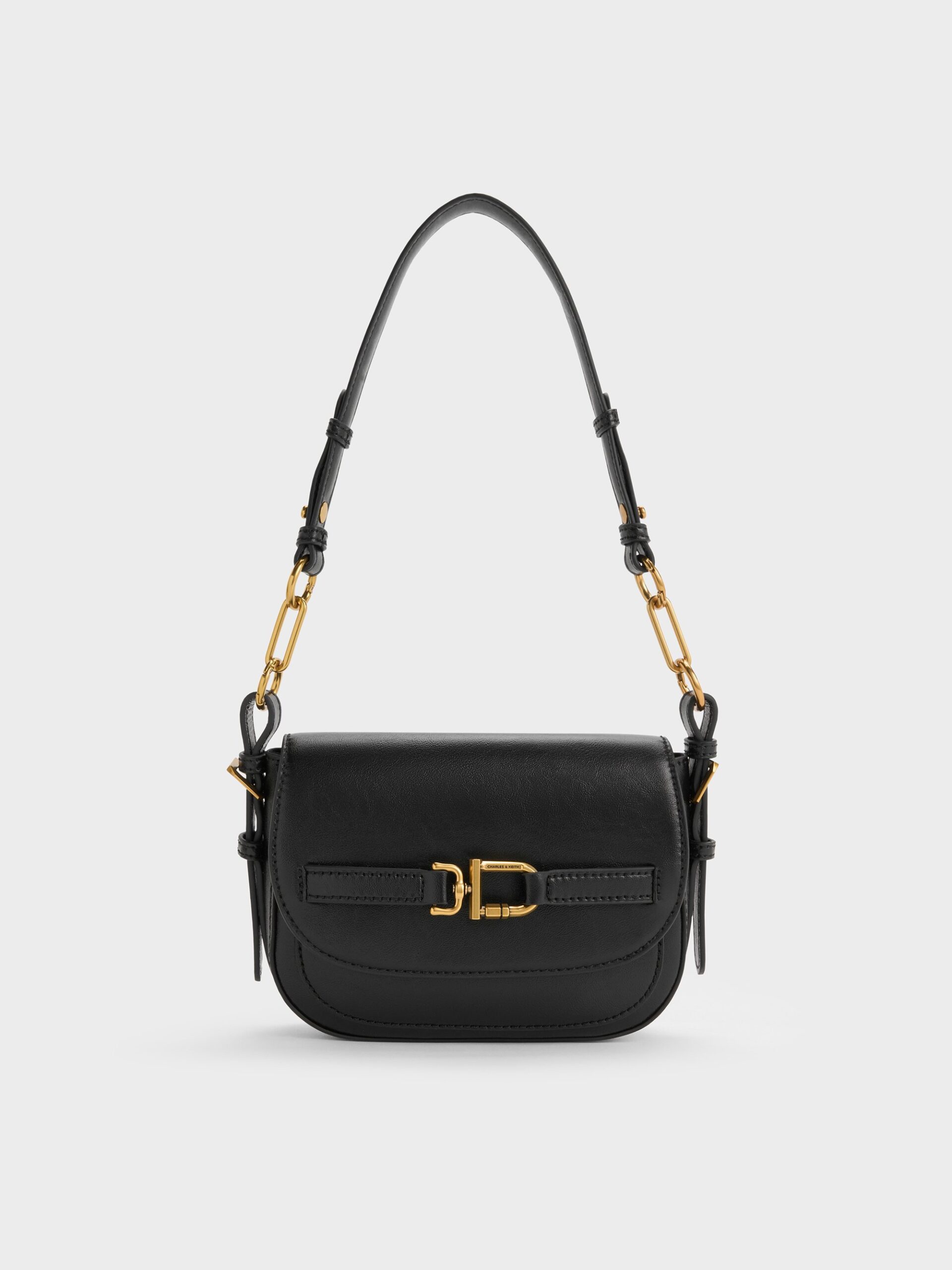 This Gwynne crossbody bag in black features a saddle silhouette with softly rounded edges, a curved front flap with a belted detail, striking metallic accents and two detachable shoulder straps. It will easily hold all your daily essentials.This product contains recycled material.