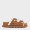 Want to wear sandals in the winter? Look no further than these Hannah double-strap sandals. They feature a winter-friendly twist with fur linings that will envelop your feet in warmth and comfort. Their fluffy look makes a bold statement, exuding soft elegance while balancing the edgy double-strap design. The rich brown finish, with its suede-like texture, will complement a wide range of outfits, adding a luxurious touch to any look.