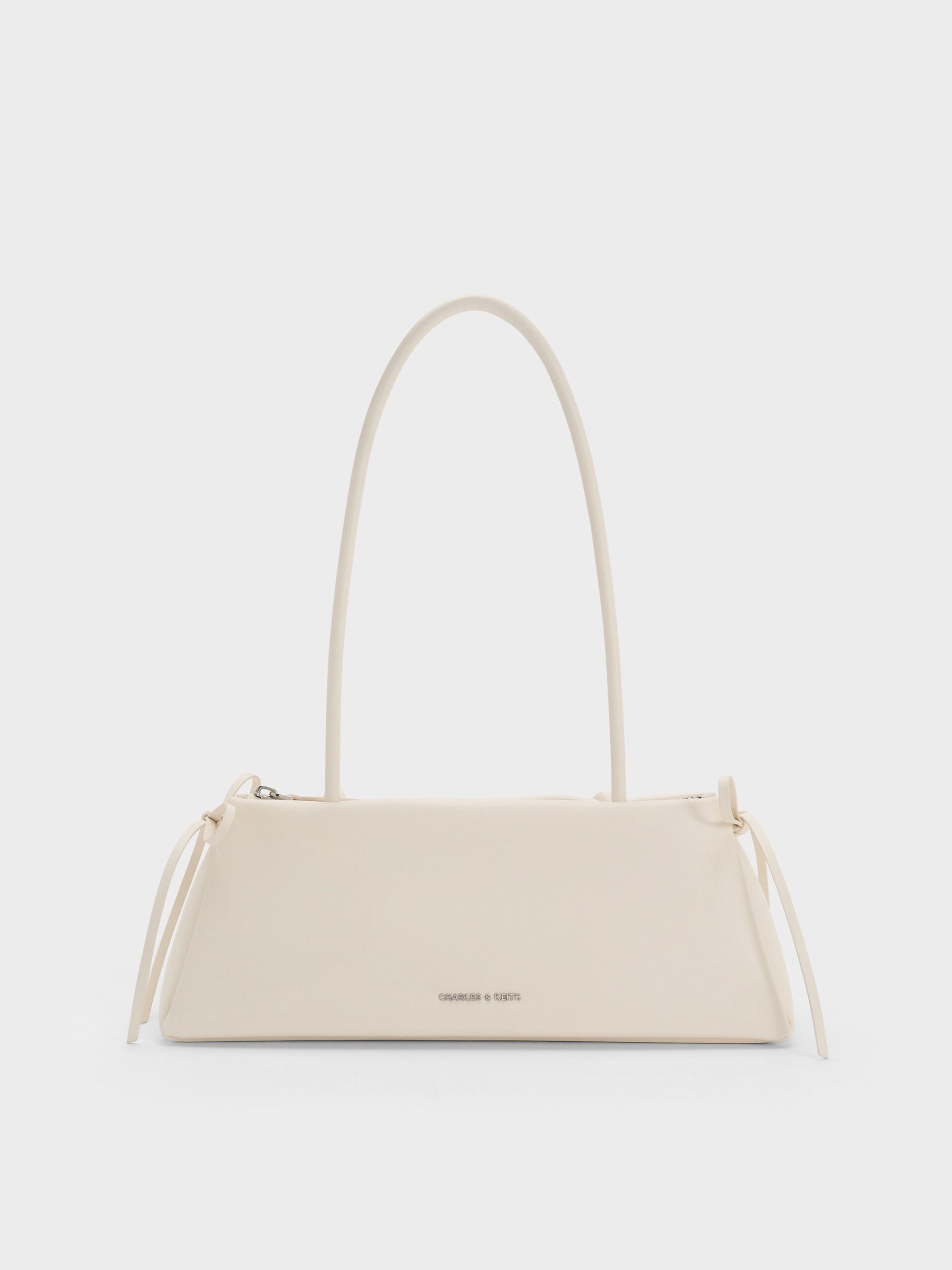 This Hazel shoulder bag in cream features a sleek trapeze silhouette, elongated double handles and side-bow accents for a feminine touch. Carry it with tailored outfits or soft layers to achieve a balanced look that feels polished and graceful.