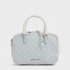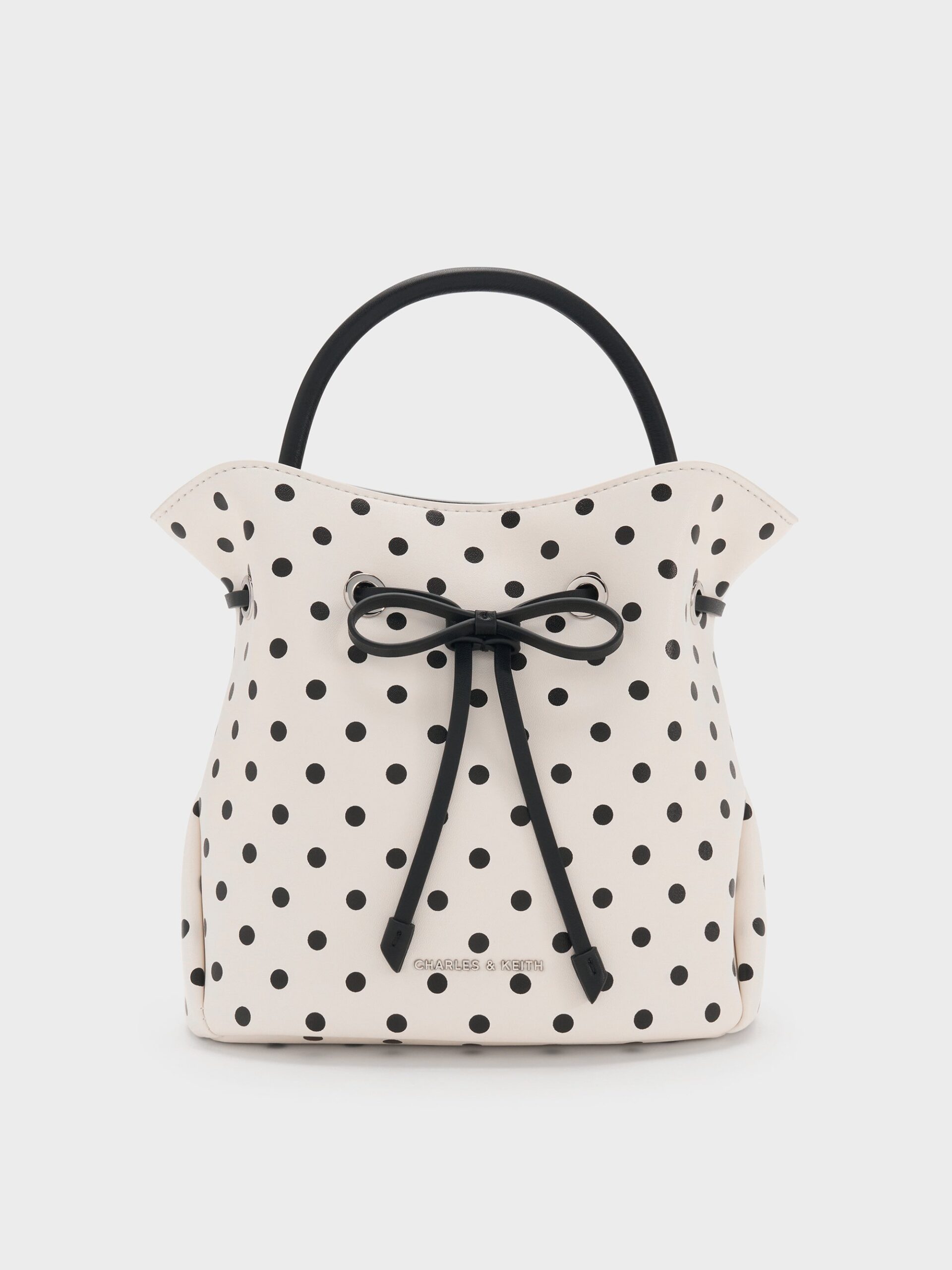 This Hazel bucket bag in cream features a polka-dotted design, a charming bow detail that also functions as a drawstring tie, a magnetic closure, a non-detachable top handle and a detachable shoulder strap. Carry it to elevate your weekend ensembles with striking visual interest.