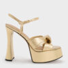 These Jayce sandals in gold are made with metallic leather and feature knot-bow details, platform soles and towering block heels. Wear them to add bold glamour and confident height to festive or evening attire.
