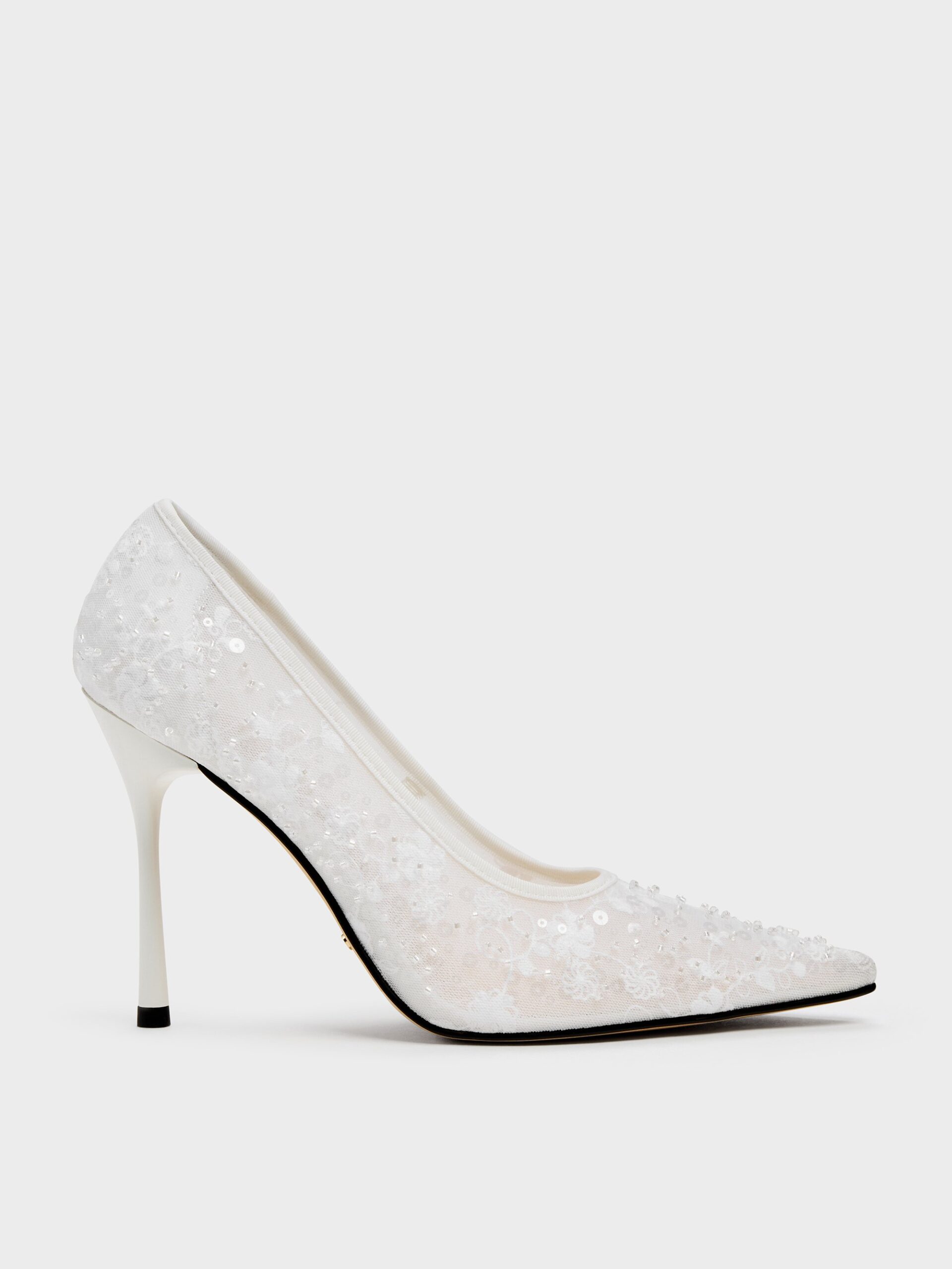 These Kyra pumps in white are made with mesh and feature embroidered flower details, intricate beaded embellishments, sleek pointed toes and elegant flared heels. Perfect for a bridal look, they will also work well for any special-occasion ensemble.