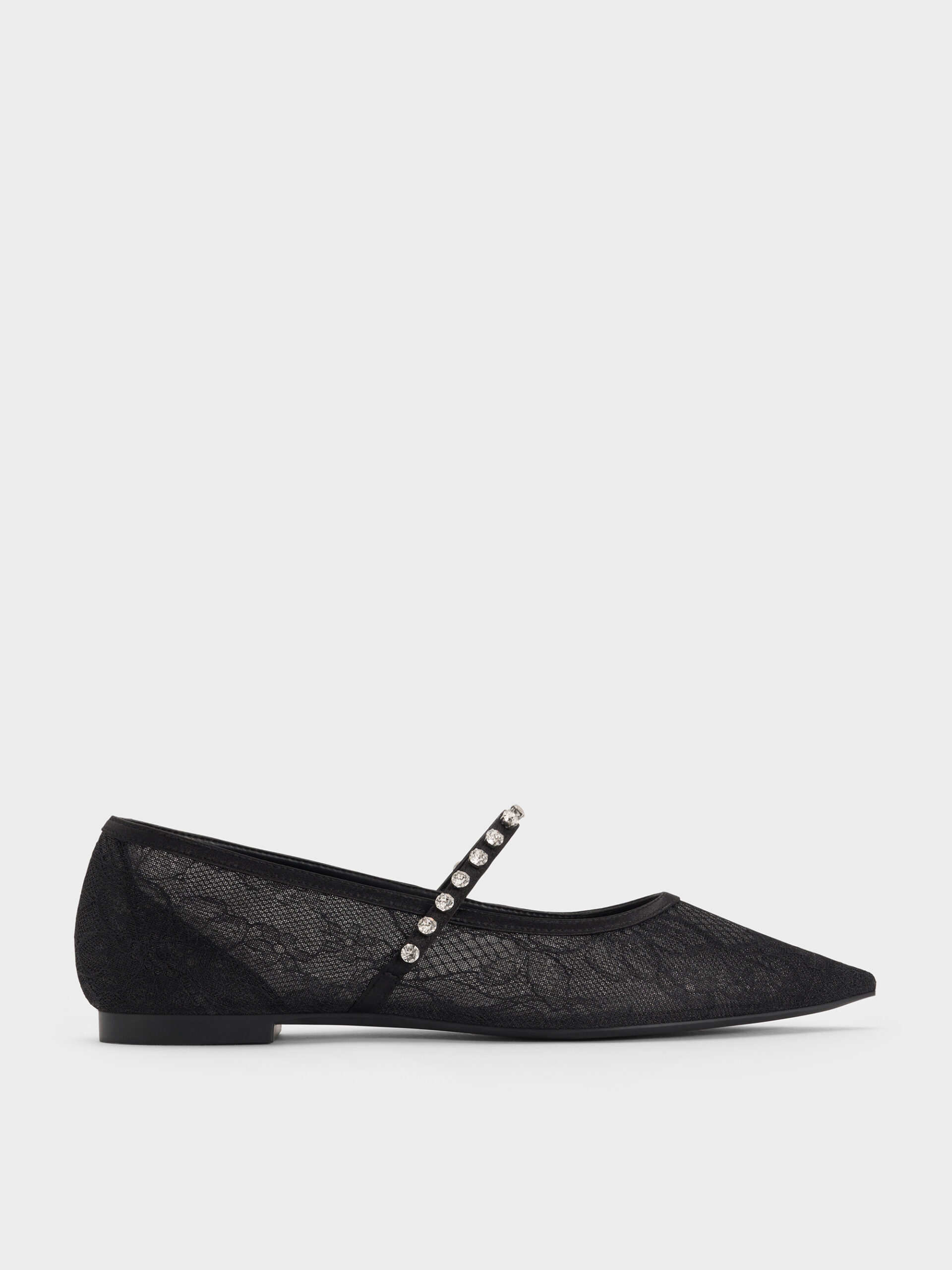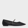 These Mary Jane flats in black are made with lace and satin. They feature sleek pointed toes and crystal-embellished straps. Let them complete your after-dark looks with elegance and charm.
