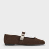 These Lando Mary Jane flats in dark brown are made with faux suede and feature metallic buckles, straps across the vamps and rounded square toes. Use them to soften tailored outfits with luxurious texure and subtle sophistication.Suede shoes require special care. For cleaning tips, please refer to our detailed guide here.