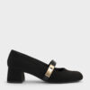 These Lando Mary Jane pumps in black are made with faux suede and feature metallic buckles, block heels and rounded square toes. Wear them with tailored trousers or midi skirts to create a workday look that is smart and versatile.