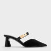 These Lando mules in black are made with velvet and feature pointed toes, metallic buckles, trapeze heels and straps across the vamps. Pair them with your date-night outfits to elevate them with effortless elegance.