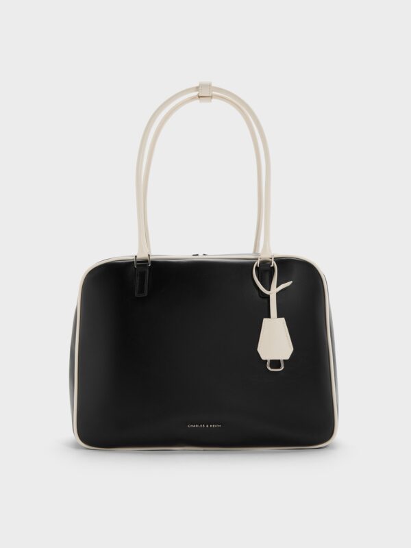 This large Sianna bowling bag features a black body with white trims, elongated handles and a boxy shape. It also comes with a keyring that doubles as a bag charm. It will add a graphic element to your outfit while keeping your belongings secure and accessible.