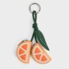 This charm is in the shape of a light-yellow lemon. It is knotted together with a large green leaf and looped on a polished silver-tone ring clasp. A great accessory for spring, it can be used as a keychain or as a bag charm.