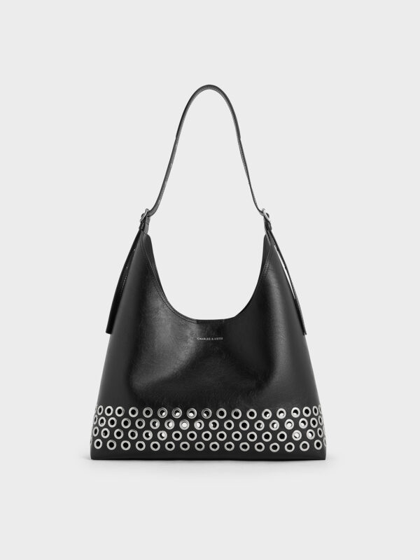 This Liv hobo bag in noir is the perfect piece to bring a touch of edginess to your outfits. The grommet details on the bag exterior and shoulder straps will set you apart from the crowd. With a distinctive angular-shaped silhouette, the comfortable drop length ensures you can easily access your belongings. It will also sit comfortably on your body even when worn as a crossbody.