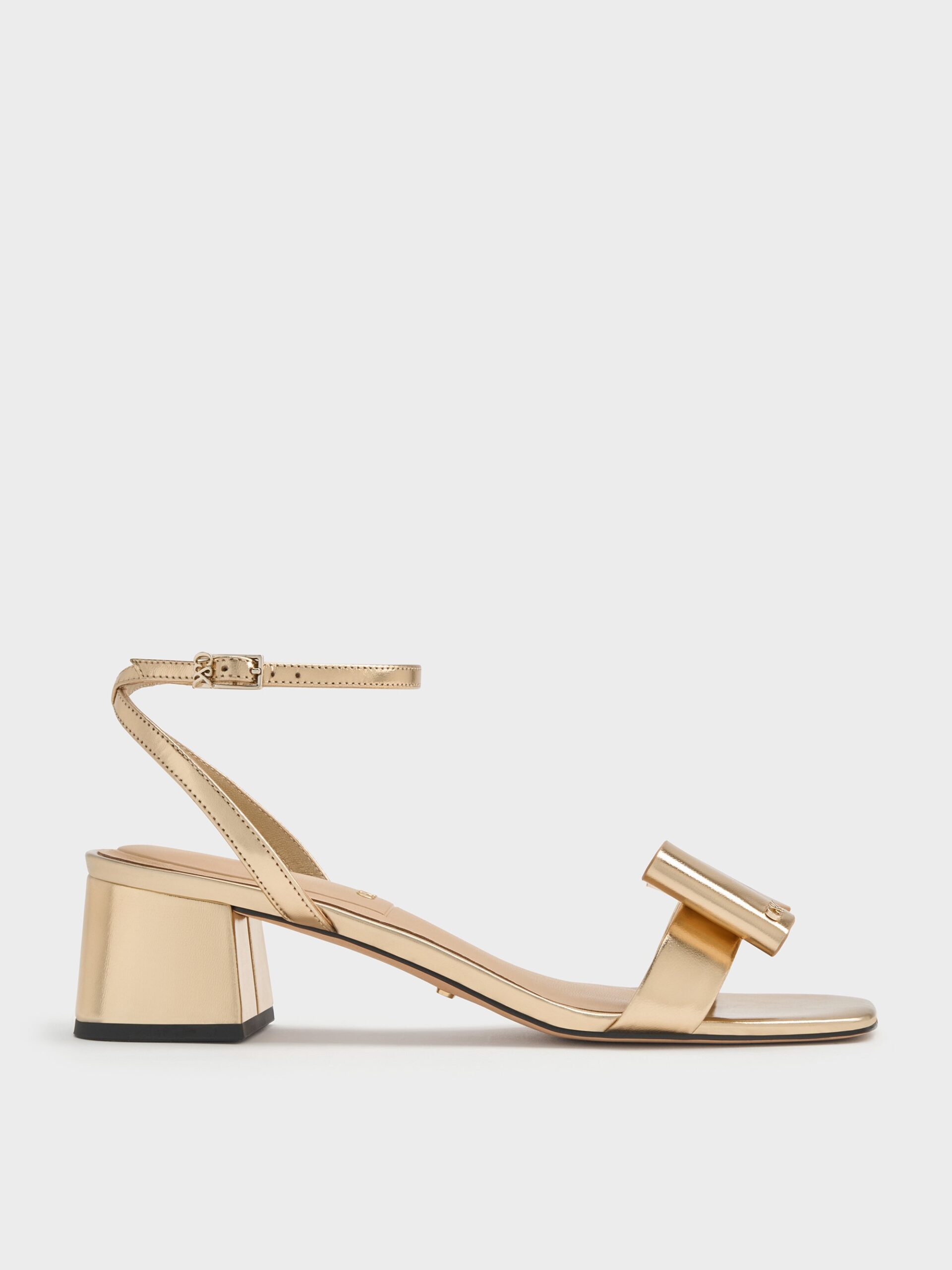 Elevate your ensemble with these sleek gold sandals, featuring chic block heels, modern ankle straps and eye-catching bow details. Perfect for both everyday wear and special occasions, their refined design offers comfort and sophistication in every step.