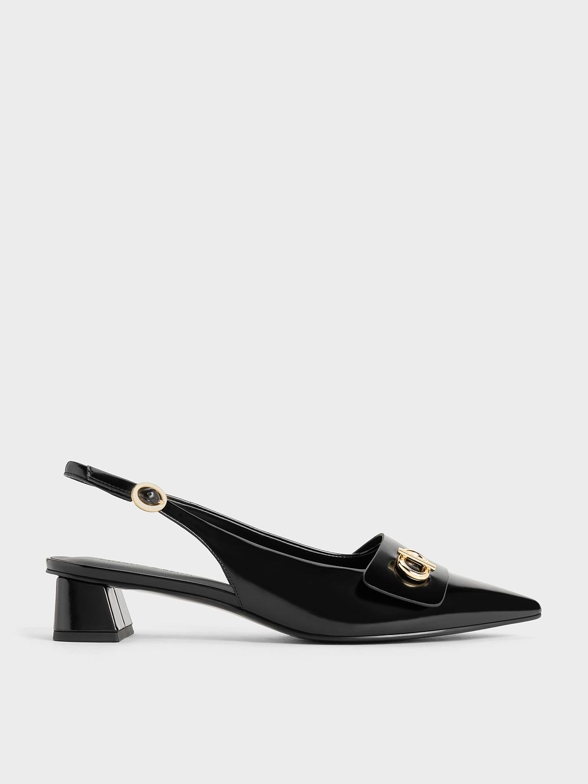 On the hunt for the perfect black shoes? These slingback pumps are the top choice. Sleek pointed toes are graced by gold-toned metallic accents for a timelessly sophisticated profile. Buckled slingback straps introduce breathability to the closed-toed style while streamlining the silhouette. Elevated by low block heels, they have a flattering leg-lengthening effect — pair these shoes with a crisp jumpsuit or silky maxi dress for best results.