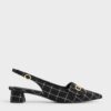 On the hunt for the perfect black shoes? These slingback pumps are the top choice. Sleek pointed toes are graced by gold-toned metallic accents for a timelessly sophisticated profile. Buckled slingback straps introduce breathability to the closed-toed style while streamlining the silhouette. Elevated by low block heels, they have a flattering leg-lengthening effect — pair these shoes with a crisp jumpsuit or silky maxi dress for best results.