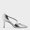These d’Orsay pumps in silver feature a metallic finish, asymmetrical straps, pointed toes and stiletto heels. Wear them with monochromatic outfits for a striking contrast that communicates tasteful glamour and a bold sense of style.