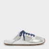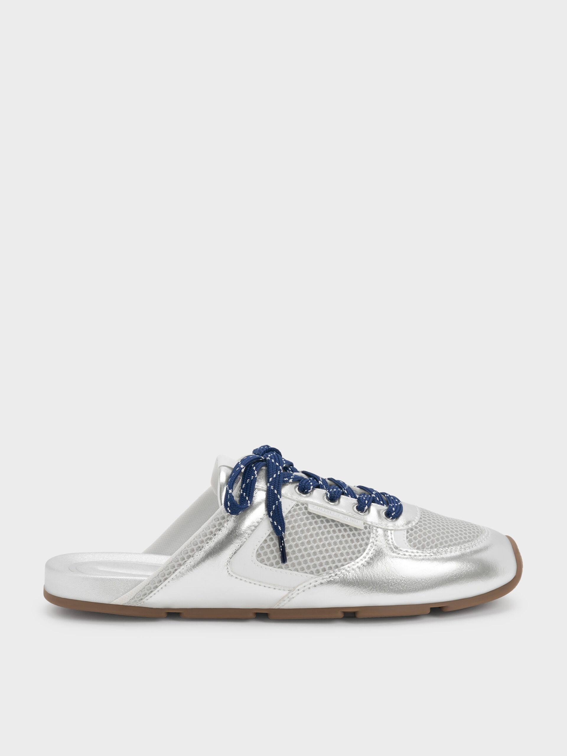 These slip-on sneakers in silver feature a metallic finish, mesh panels, patterned laces and comfortable flat soles. Wear them with jersey separates for a casual look that is both fuss-free and thoughtfully styled.