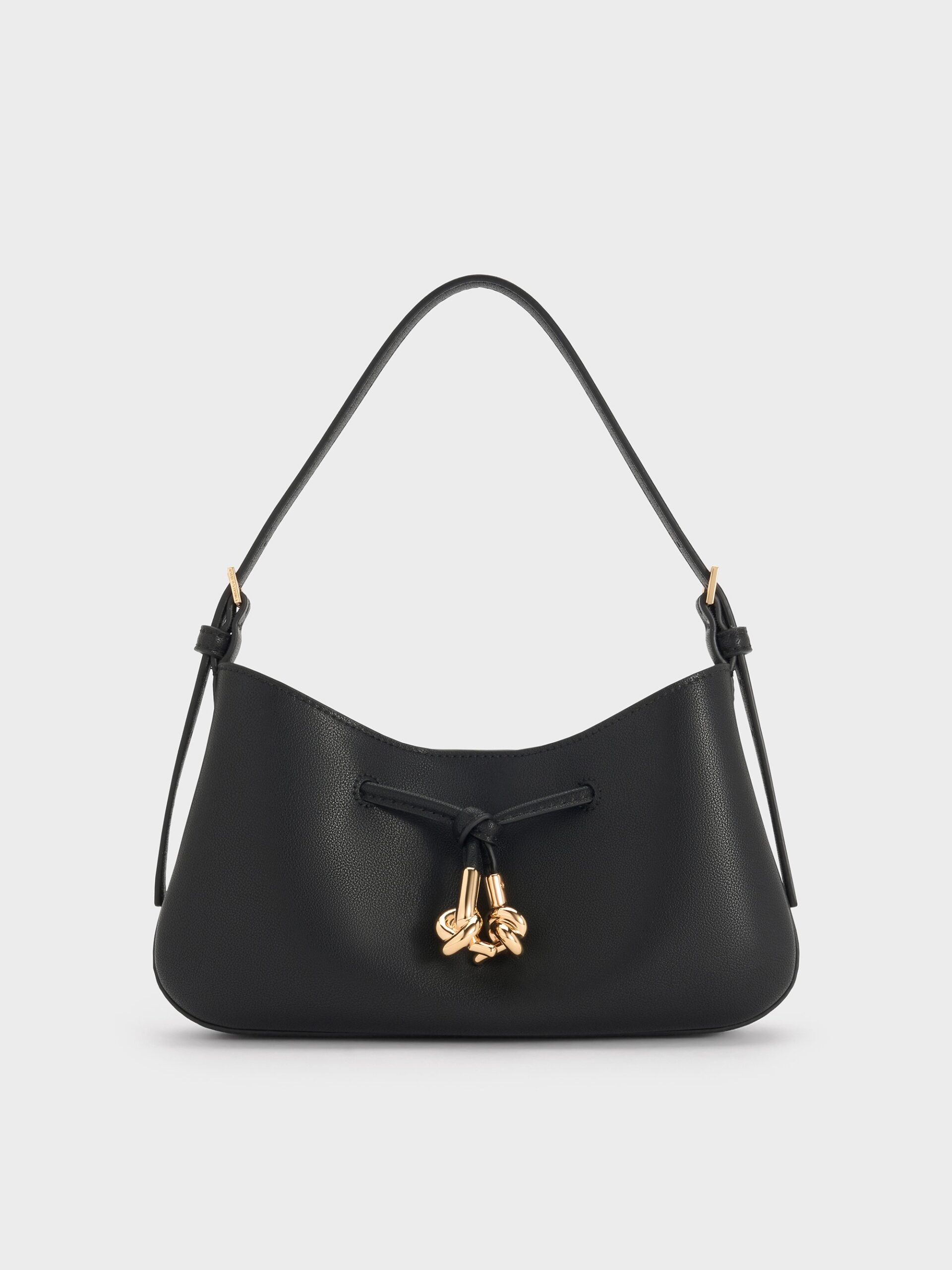 This Mila shoulder bag in black features metallic knotted details and an elegant curved silhouette. It comes with two shoulder straps — one short and one long — so you can carry it in different ways. Pair it with structured blazers and pleated skirts for a dressy look that transitions seamlessly from the office to after-work dinners.