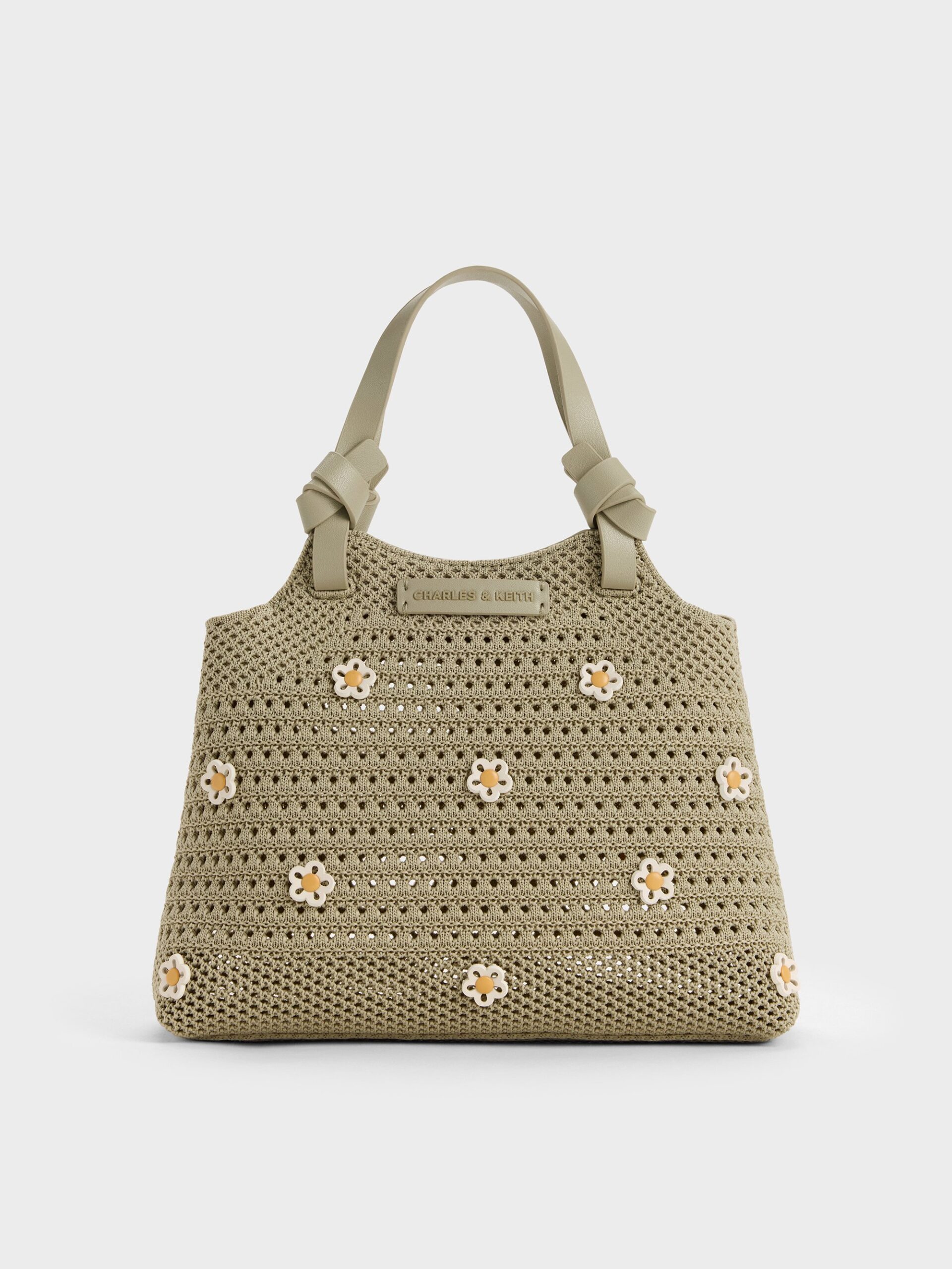 This Ida tote bag in pale olive features knotted top handles, a knitted finish adorned with colourful flower appliques and a detachable shoulder strap for hands-free convenience. Use it to add an cute and eye-catching element to casual warm-weather looks.