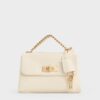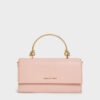 In pretty light pink, this bag will put the finishing touch to a feminine outfit. This bag can be carried in hand or on the shoulder with the longer chain strap while the chain handle dangles for a dressier touch. The clochette also features heart and key motifs complete with c and k initials and our logo engraved for extra charm.