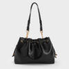 This mini Moxie bucket bag in black features a drawstring closure, adjustable double handles, a detachable chain strap and striking metallic accents. It will hold all your essentials and is perfect for travel-light days.