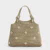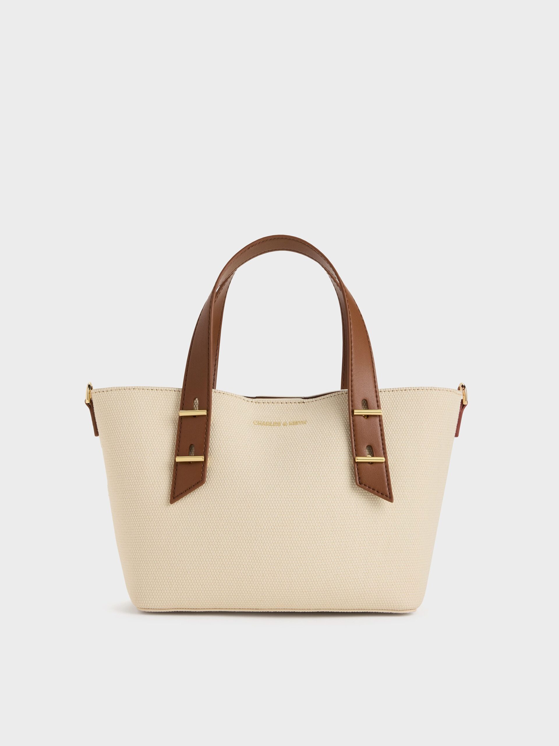 This mini Shania tote bag features a main canvas body with contrasting brown double handles, a softly structured silhouette, metallic accents, a detachable shoulder strap and a removable small pouch. Use it to add a stylish element to relaxed weekend outfits.