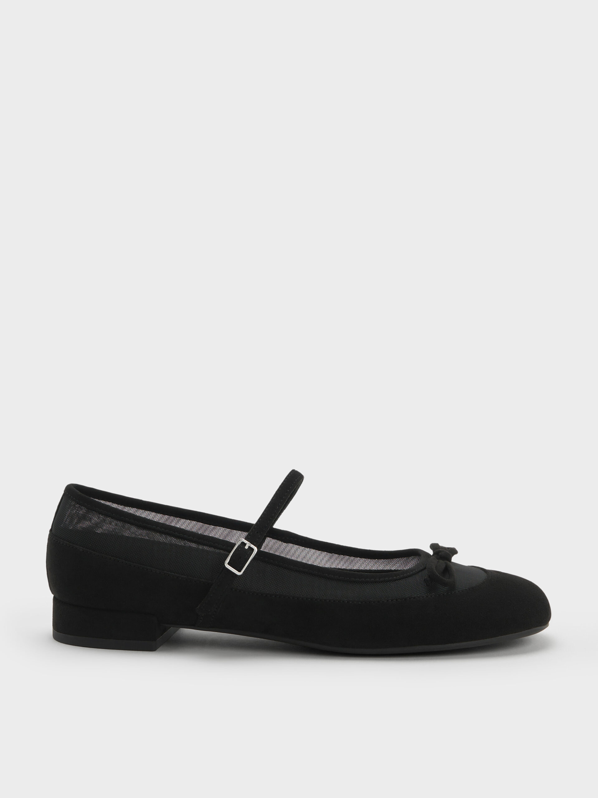 These Mulligan Mary Janes in black are made with faux suede and mesh. They feature dainty bows, covered round toes and slim adjustable straps for a comfortable fit. Let them complete your relaxed work outfits with a feminine touch.Suede shoes require special care. For cleaning tips, please refer to our detailed guide here.