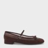 These Mulligan Mary Janes in dark brown are made with faux suede and mesh. They feature dainty bows, covered round toes and slim adjustable straps for a comfortable fit. They will pair equally well with both feminine dresses and tailored pieces.Suede shoes require special care. For cleaning tips, please refer to our detailed guide here.