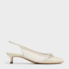 These Mulligan slingback pumps in black are made with faux suede and mesh. They feature dainty bow details, low kitten heels, elasticised slingback straps and elegant almond toes. Wear them to bring girlish charm to versatile day-to-night outfits.